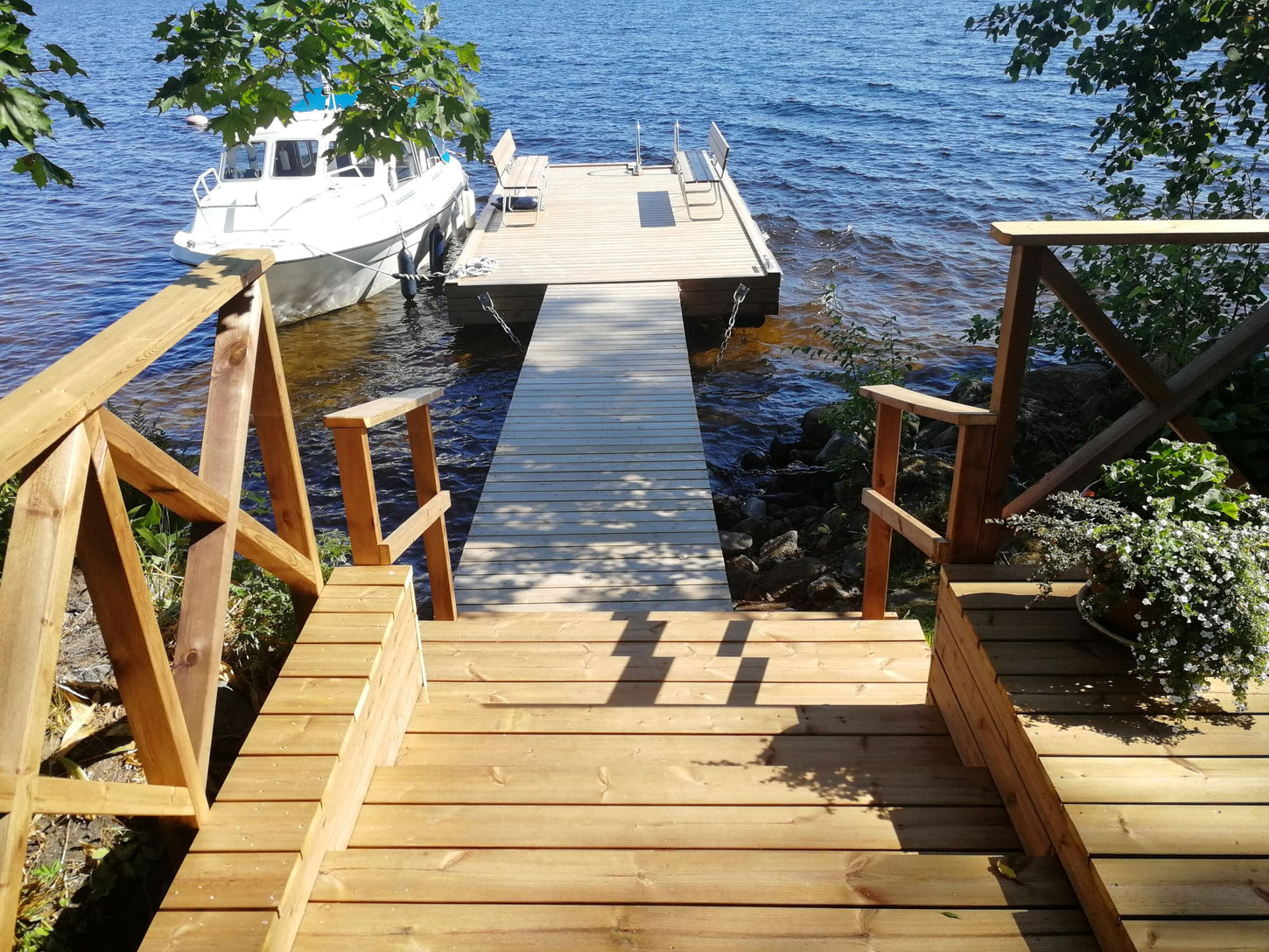 Suunnittelin uuden laiturin hankkimista ja Laatulaiturin Juha tuli käymään paikan päällä. Todettiin, että vanha laituri oli vielä sen verran hyvässä kunnossa, että päädyimme laiturin ehostamiseen. Vanha laituri on nyt uudenveroinen. Homma toimi hyvin kaikin puolin.